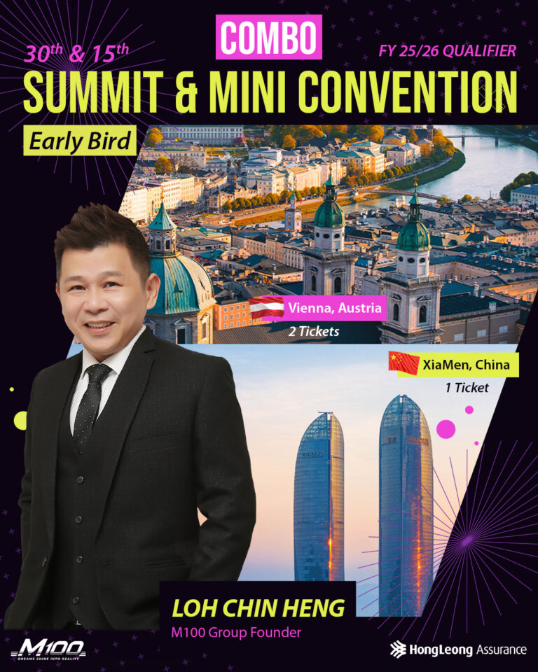 让我们热烈祝贺 M100 冠军领袖 Mr Loh Chin Heng 达成 Early Bird Combo 30th Summit Convention和 15th Mini Convention双重荣耀成就!